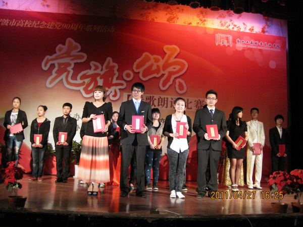 日前,由宁波市高校办主办的市高校庆祝建党90周年“党旗·颂”大学生诗歌朗诵大赛在浙江工商职业技术学院举行。由我校选送的林立和王味两位选手在陆季春、周余老师的指导下参加了本次大赛。比赛中,两位选手以满腔热情表达了对党的忠诚和爱戴,充分展现了我校学子的良好精神面貌,并一举夺得大赛一等奖和三等奖,为学校赢得了荣誉。