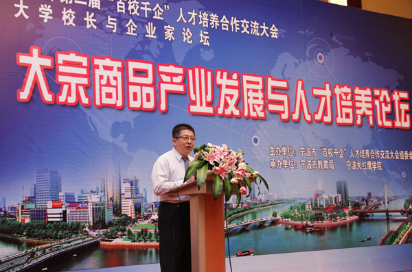 5月27日下午,作为宁波市第二届“百校千企”人才培养合作交流大会主要内容之一的“大宗商品产业发展与人才培养论坛”在香格里拉大酒店举行。西安邮电大学副校长温小郑博士、商务部国际贸易合作研究院市场研究部副主任白明研究员、北京工商大学证券期货研究所所长胡俞越教授、宁波神化化学品经营有限责任公司高级分析师纪鸿聪、长城企业战略研究所执行总监王峰等应邀为本次论坛作专题报告。宁波市委人才工作领导小组办公室副主任刘骏、市教育局副局长胡赤弟、市科技局副局长何晓南、市科协秘书长张定科,我校领导孙惠敏、李羽、高振强等出席了本次论坛。论坛由副校长张舜德主持。