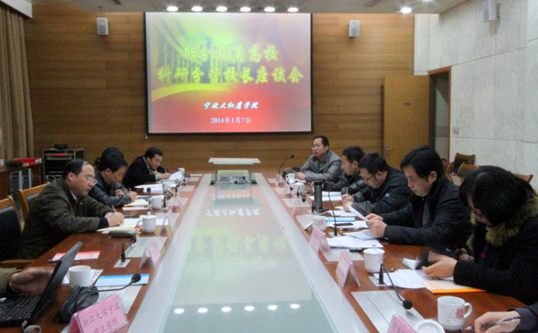 1月7日,由宁波市教育局主办、我校承办的部分在甬高校科研工作分管校长座谈会在信息大楼105室举行。市教育局副局长胡赤弟,高教处处长严新桥、副处长王勇出席座谈会,宁波大学、浙大宁波理工学院、浙江万里学院、宁波工程学院、宁波大红鹰学院、宁波工商职业技术学院、宁波服装纺织学院、宁波城市学院、宁波职业技术学院、宁波卫生职业技术学院等10所高校的科研工作分管校长、科研处长共同参加了座谈会。