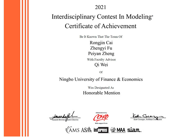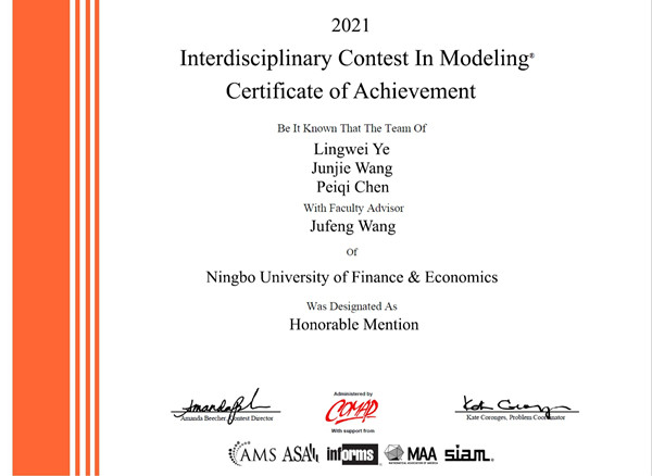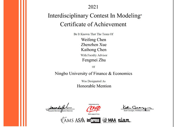 我校学子获2021年美国(国际)大学生数学建模竞赛二等奖