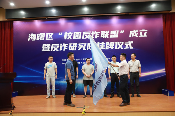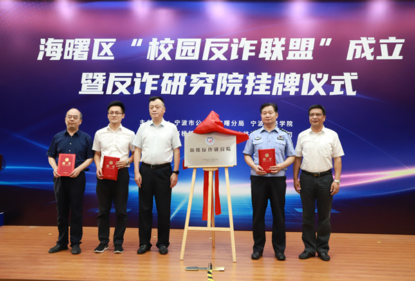 仪式现场还同步成立了海曙“校园反诈联盟”,该联盟成员包括我校及宁波工程学院、浙江工商职业技术学院、宁波外事学校、宁波第二技师学校、宁波市甬江职业高中、宁波市古林职业高中、海曙公安分局、海曙团区委、海曙区司法局等,未来将通过建立工作例会、案件通告、联合督导等各项机制,常态开展新形势下校园反诈研究工作。