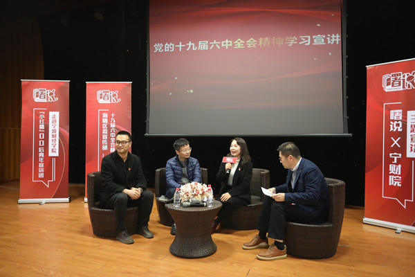 11月22日,我校学习党的十九届六中全会精神主题宣讲会暨“宁财青年博士说”第二期活动举行,海曙区委宣传部副部长、文明办主任、新闻出版局局长齐海峰,校党委副书记吴勇出席。海曙团区委有关负责人、各乡镇街道青年宣讲员及我校青年师生代表等参加活动。